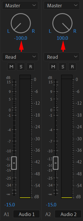 Now A1 will only output to the left, and A2 to the right. You can test this by muting one of the tracks. The other track should only play on its designated speaker. Now you can open your Export menu and select Stereo as your Channels Layout to export your mono split tracks.